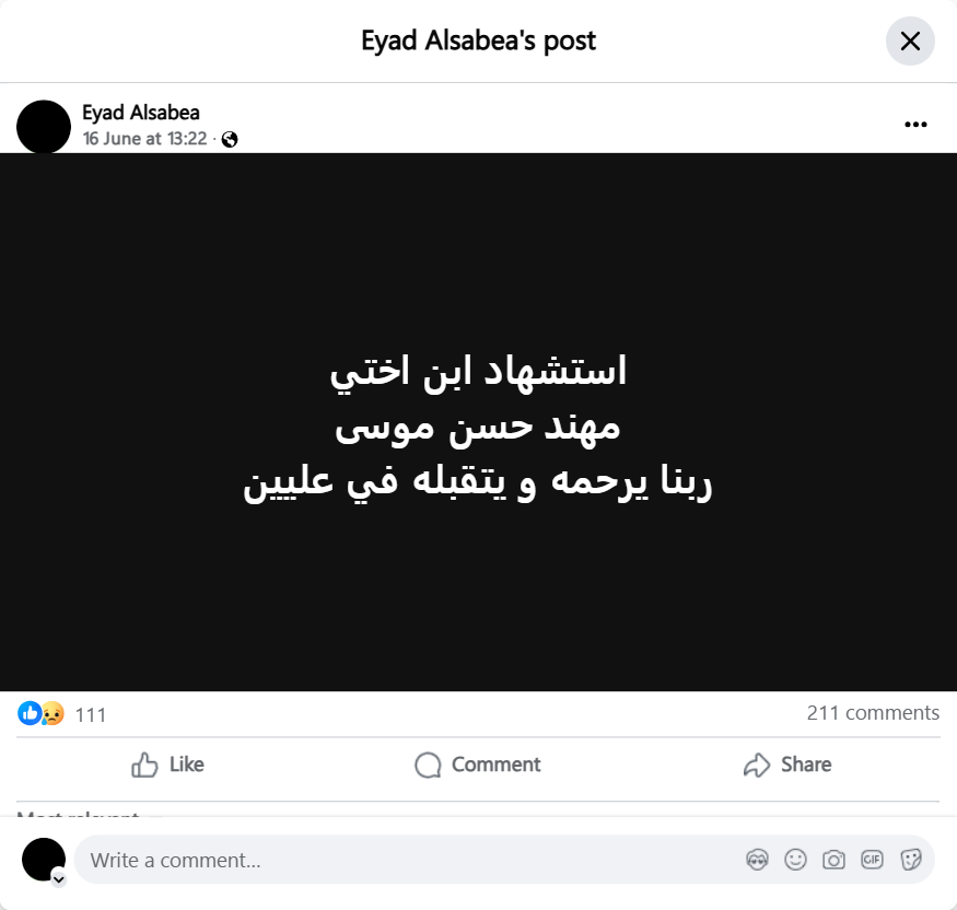 Archive URL: https://airwars.org/source/www-facebook-com-eyad-alsabea-pfbid02y1hgzuho5cqlnpuehrhebdt5oql4ppaa4imwkzey9ne9ofl3ygtsfr5y1fapi1ejl-2025-06-16-112200/