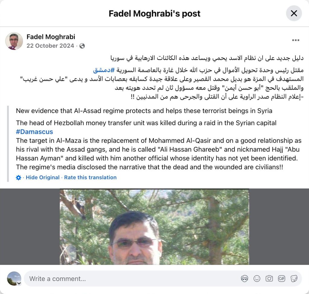 New evidence that the Assad regime protects and aids these terrorist entities in Syria: The head of Hezbollah's money transfer unit was killed in a raid in the Syrian capital, Damascus. The target in Al-Maza was the replacement for Mohammed Al-Qasir and, like his predecessor, had close ties to the Assad regime. He was named Ali Hassan Ghareeb, nicknamed Hajj Abu Hassan Ayman. A second official, whose identity has not yet been determined, was also killed.
