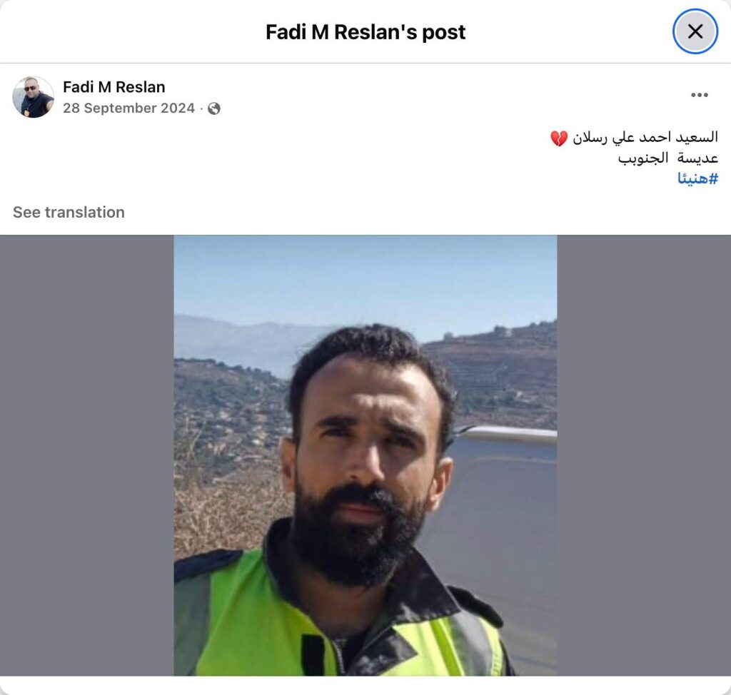 Archive URL: https://airwars.org/source/www-facebook-com-fadi-m-reslan-pfbid0wpnyicqcaegrn945xvio2netnpgflrjuhbqafndnkpppm3t8g57mauquaxj9zzbpl-2024-09-28-110000/