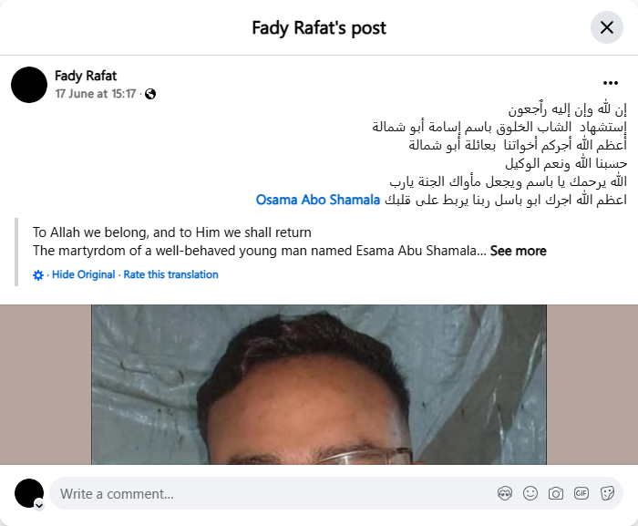 The martyrdom of the honorable young man, Osama Abu Shamala. May God reward you greatly, our sisters in the Abu Shamala family.