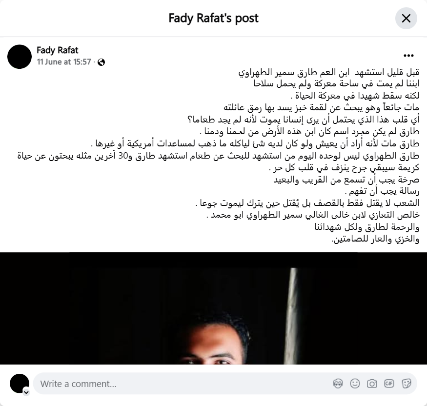 A few moments ago, our cousin Tariq Samir al-Tahrawi was martyred. Our son did not die on a battlefield, nor did he carry a weapon, but he fell as a martyr in the battle of life. He died hungry while searching for a morsel of bread to feed his family. What kind of heart can bear to see a human being die because he could not find food? Tariq was not just a name, he was a son of this land, made of our flesh and blood. Tariq died because he wanted to live, and if he had something to eat, he would not have sought American or other aid. Tariq al-Tahrawi is not the only one who was martyred today searching for food. Tariq and 30 others like him were martyred searching for a dignified life. A wound will remain bleeding in the heart of every free person. A cry that must be heard from near and far. A message that must be understood. People are not only killed by bombing, but they are killed when they are left to die of hunger. My sincere condolences to my dear cousin Samir al-Tahrawi, Abu Muhammad. Mercy to Tariq and to all our martyrs, and shame and disgrace to those who remain silent.