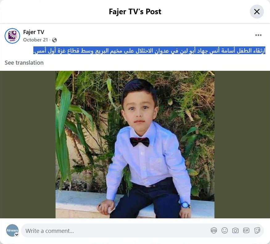 The child Osama Anas Jihad Abu Laban was martyred in the occupation’s aggression on Al-Bureij camp in the central Gaza Strip the day before yesterday.