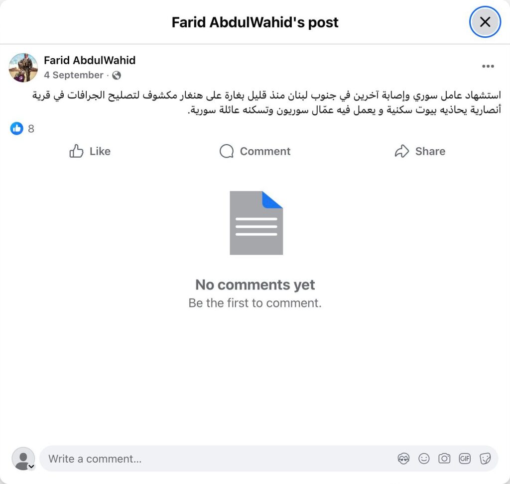 استشهاد عامل سوري وإصابة آخرين في جنوب لبنان منذ قليل بغارة على هنغار مكشوف لتصليح الجرافات في قرية أنصارية يحاذيه بيوت سكنية و يعمل فيه عمّال سوريون وتسكنه عائلة سورية.