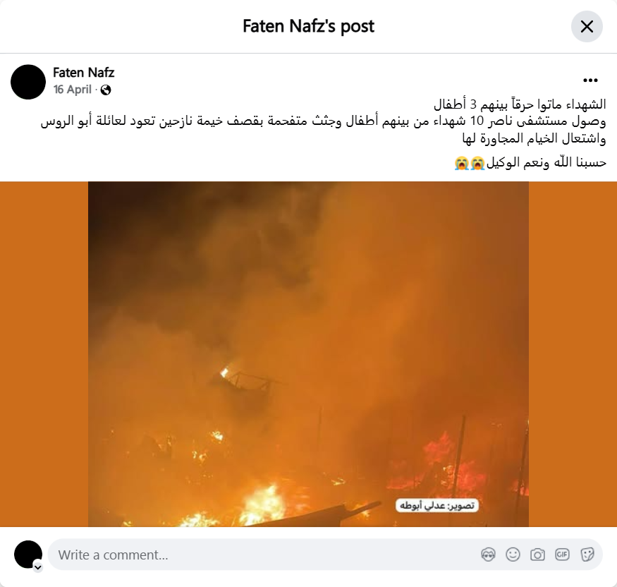 The martyrs were burned to death, including 3 children. 10 martyrs, including children, and charred bodies were found at Nasser Hospital after a displaced persons' tent belonging to the Abu Al-Rous family was bombed, and the tents adjacent to it caught fire. God is sufficient for us, and He is the best Disposer of affairs.