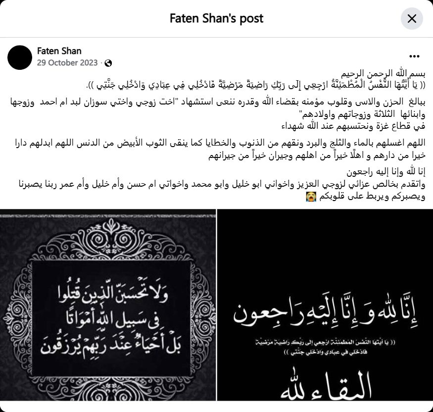 ( With deep sorrow and grief, and hearts that believe in God's will and destiny, we mourn the martyrdom of "my sister-in-law, my sister Susan Labad, Umm Ahmed, her husband, her three sons, their wives, and their children"