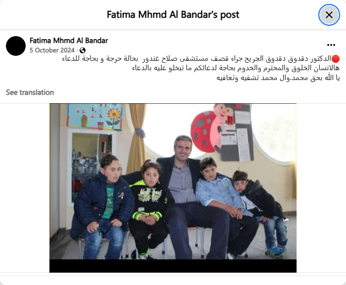 الدكتور دقدوق دقدوق الجريح جراء قصف مستشفى صلاح غندور بحالة حرجة و بحاجة للدعاءهالانسان الخلوق والمحترم والخدوم بحاجة لدعائكم ما تبخلو عليه بالدعاء يا الله بحق محمد.وال محمد تشفيه وتعافيه