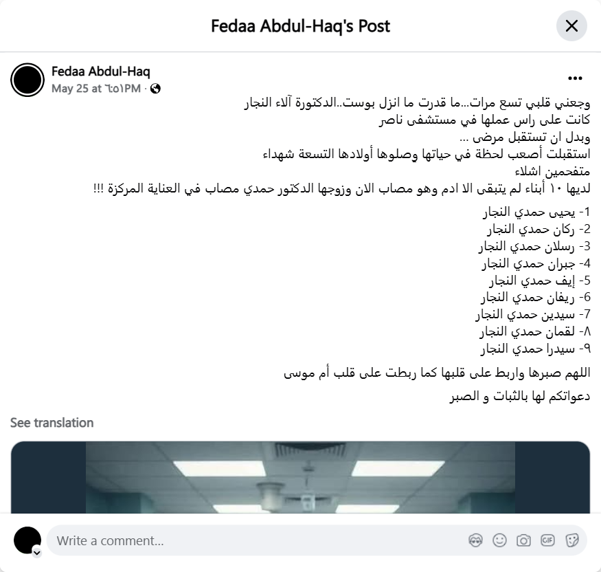 My heart ached nine times... I couldn't help but post.. Dr. Alaa Al-Najjar was at work in Nasser Hospital and instead of receiving patients... she experienced the most difficult moment of her life. Her nine children arrived as charred martyrs. She has ten children, only Adam is left and he is injured now and her husband Dr. Hamdi is injured in intensive care!!! 1- Yahya Hamdi Al-Najjar 2- Rakan Hamdi Al-Najjar 3- Raslan Hamdi Al-Najjar 4- Gebran Hamdi Al-Najjar 5- Eve Hamdi Al-Najjar 6- Revan Hamdi Al-Najjar 7- Sayedin Hamdi Al-Najjar 8- Luqman Hamdi Al-Najjar 9- Sidra Hamdi Al-Najjar