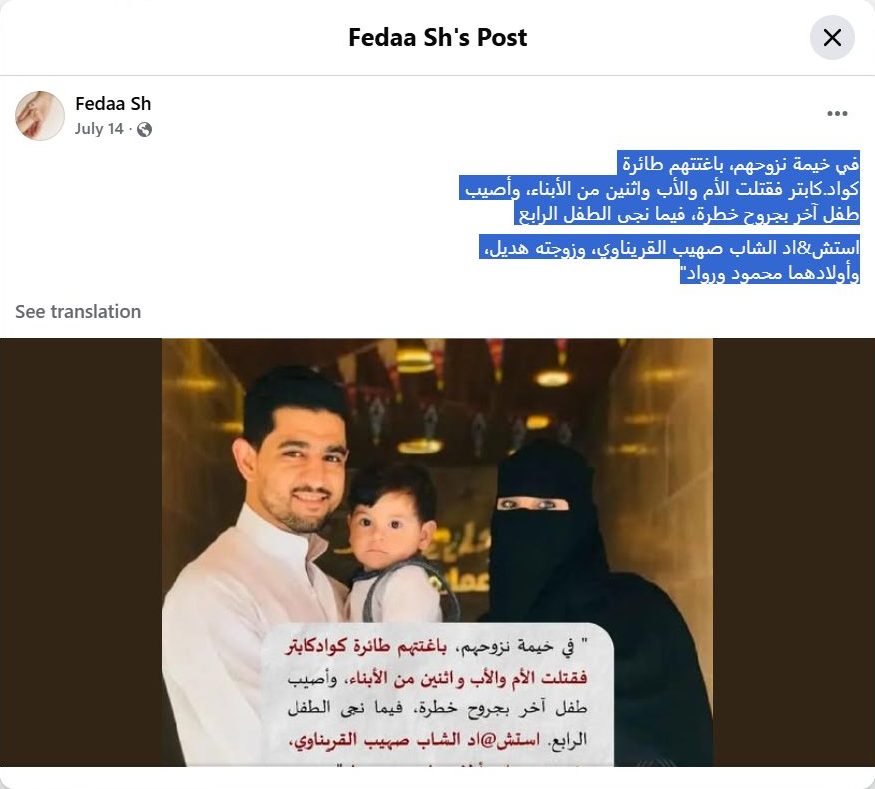 Archive URL: https://airwars.org/source/www-facebook-com-fedaa-sh-pfbid0wvv69qnqxwu3yv7sfdjhbmcadryxkgv3nfnfi9dvhn5sgx29zf1seplfzhzvuh8ul-2025-07-14-090000/