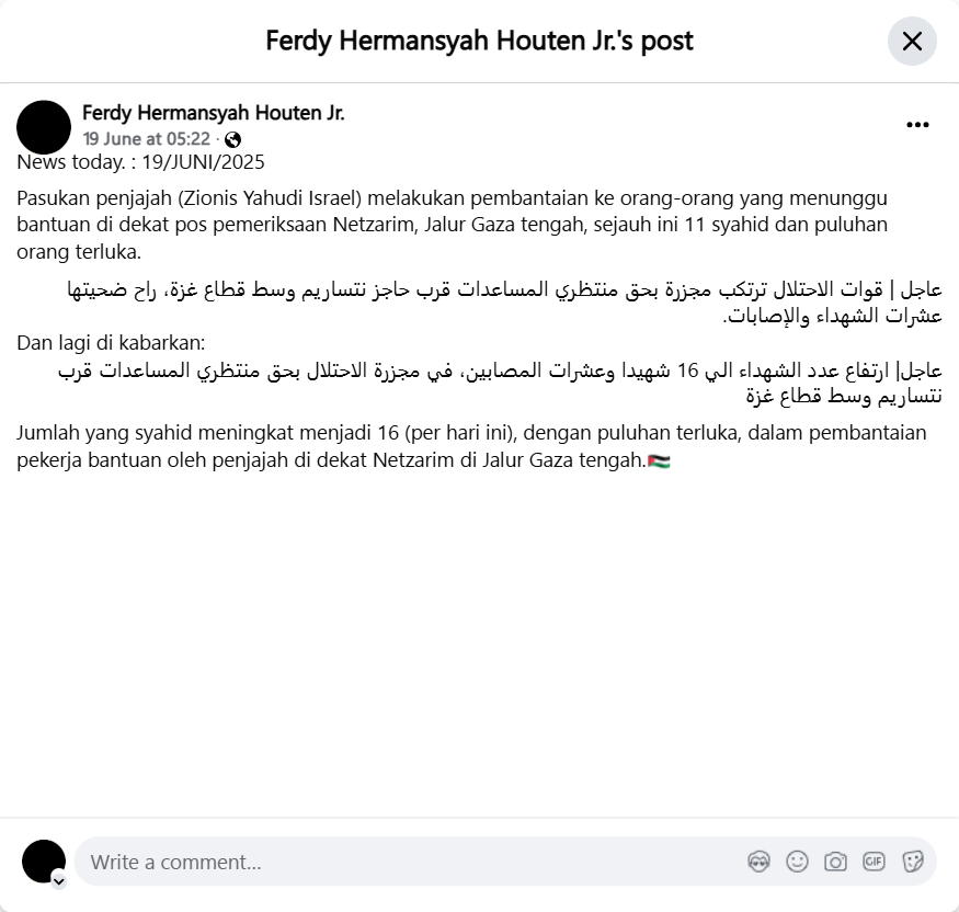 News today. : 19/JUNI/2025Pasukan penjajah (Zionis Yahudi Israel) melakukan pembantaian ke orang-orang yang menunggu bantuan di dekat pos pemeriksaan Netzarim, Jalur Gaza tengah, sejauh ini 11 syahid dan puluhan orang terluka.عاجل | قوات الاحتلال ترتكب مجزرة بحق منتظري المساعدات قرب حاجز نتساريم وسط قطاع غزة، راح ضحيتها عشرات الشهداء والإصابات.Dan lagi di kabarkan:عاجل| ارتفاع عدد الشهداء الي 16 شهيدا وعشرات المصابين، في مجزرة الاحتلال بحق منتظري المساعدات قرب نتساريم وسط قطاع غزةJumlah yang syahid meningkat menjadi 16 (per hari ini), dengan puluhan terluka, dalam pembantaian pekerja bantuan oleh penjajah di dekat Netzarim di Jalur Gaza tengah.