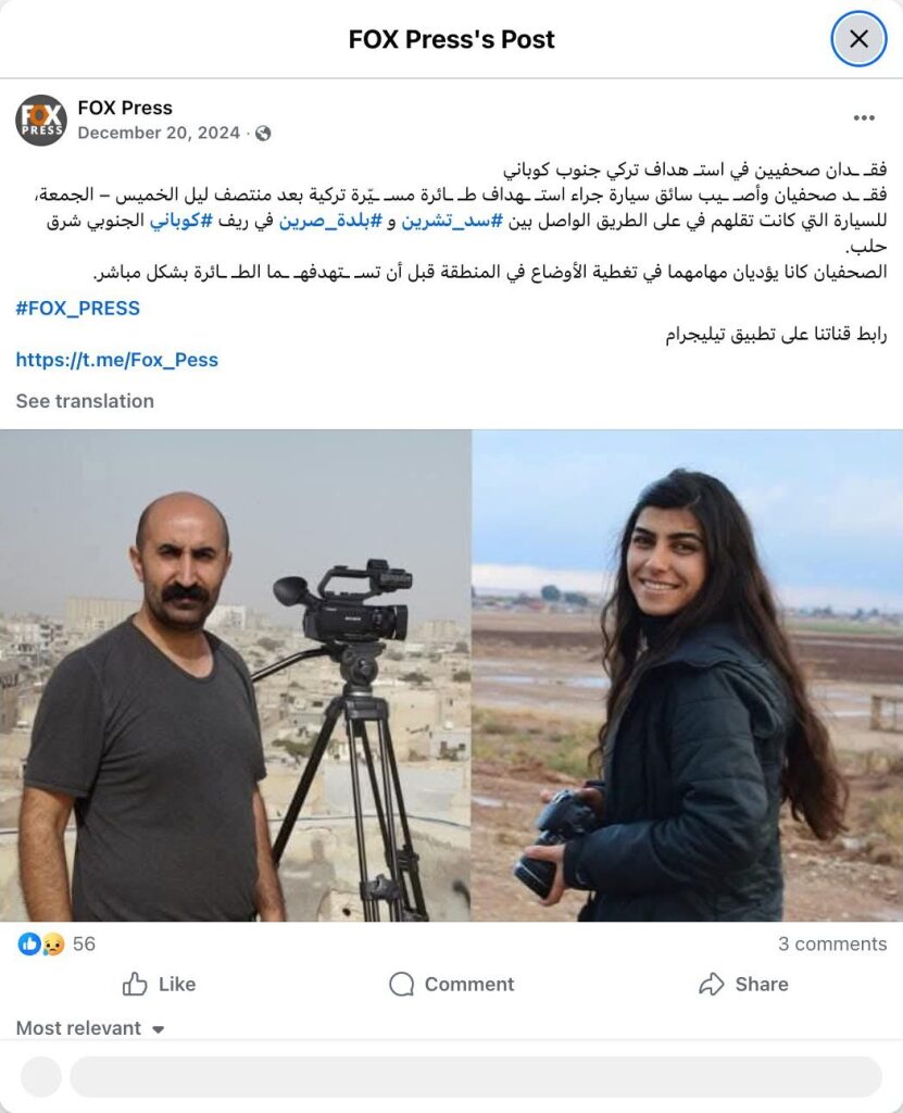 Two journalists were killed and a driver injured when a Turkish drone targeted their vehicle shortly after midnight on Thursday-Friday. The attack occurred on the road between the Tishrin Dam and the town of Sarrin in the southern Kobani countryside, east of Aleppo.