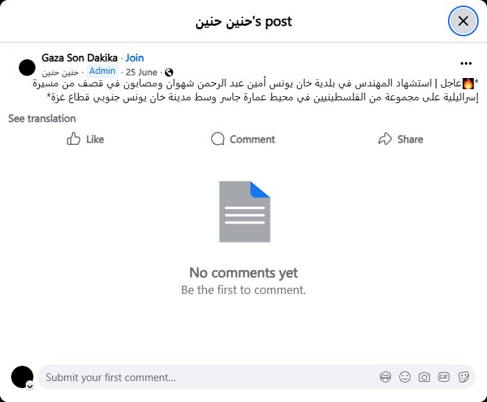 Urgent | Khan Yunis Municipality engineer Amin Abdul Rahman Shahwan was killed and several others were injured in an Israeli drone strike on a group of Palestinians near the Jasser Building in the center of Khan Yunis, south of the Gaza Strip.*