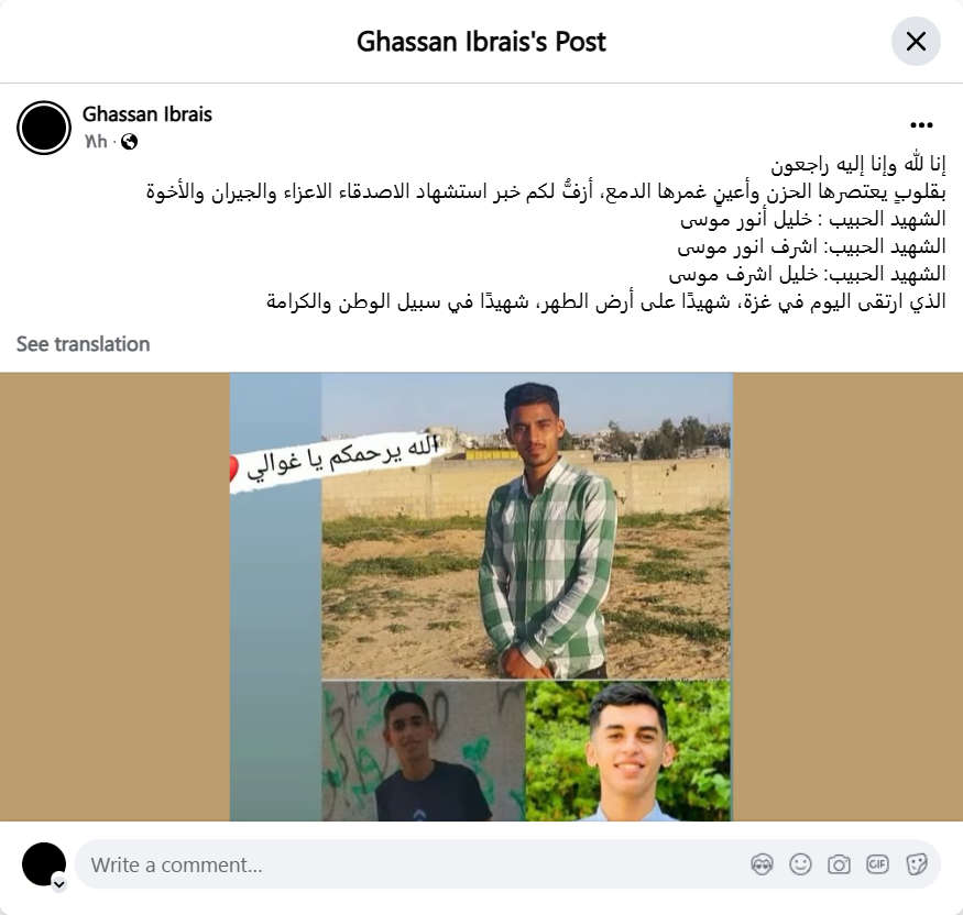 To Allah we belong and to Him we shall return. With hearts filled with sadness and eyes filled with tears, I announce to you the martyrdom of dear friends, neighbors and brothers, the beloved martyr: Khalil Anwar Musa, the beloved martyr: Ashraf Anwar Musa, the beloved martyr: Khalil Ashraf Musa, who ascended today in Gaza, a martyr on the land of purity, a martyr for the sake of homeland and dignity.