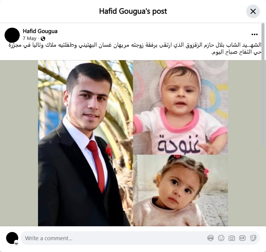 The young martyr Bilal Hazem Al-Zaqzouq, who ascended with his wife, Marihan Ghassan Al-Bahtini, and his two daughters, Malak and Talia, in the Al-Tuffah neighborhood sewer this morning.