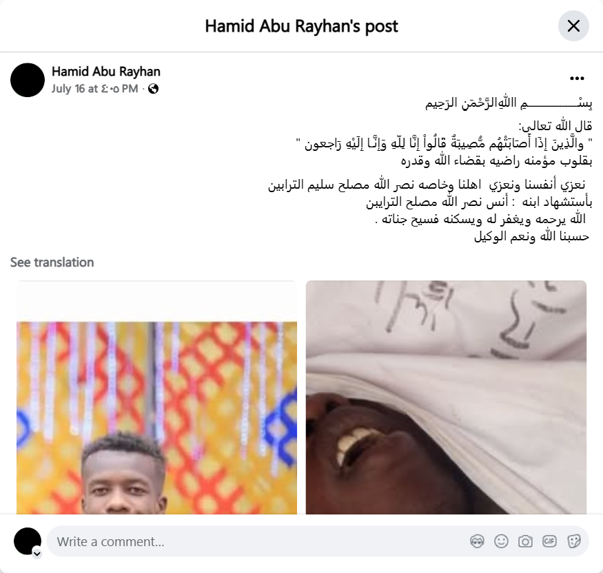 We offer our condolences to ourselves and our families, especially Nasrallah Musleh Salim Al-Tarabin, on the martyrdom of his son: Anas Nasrallah Musleh Al-Tarabin.