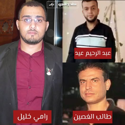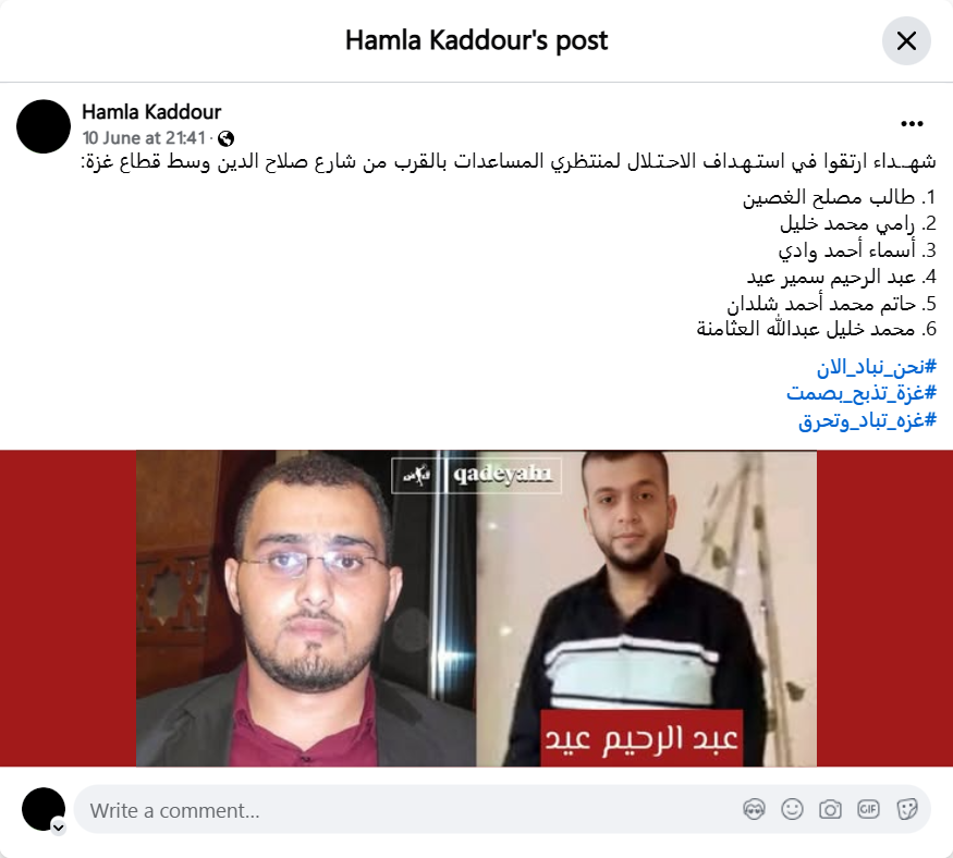 Martyrs were killed when the occupation targeted those waiting for aid near Salah al-Din Street in the central Gaza Strip: 1. Talib Musleh al-Ghussein 2. Rami Muhammad Khalil 3. Asmaa Ahmad Wadi 4. Abdul Rahim Samir Eid 5. Hatem Muhammad Ahmad Shaldan 6. Muhammad Khalil Abdullah al-Athamneh