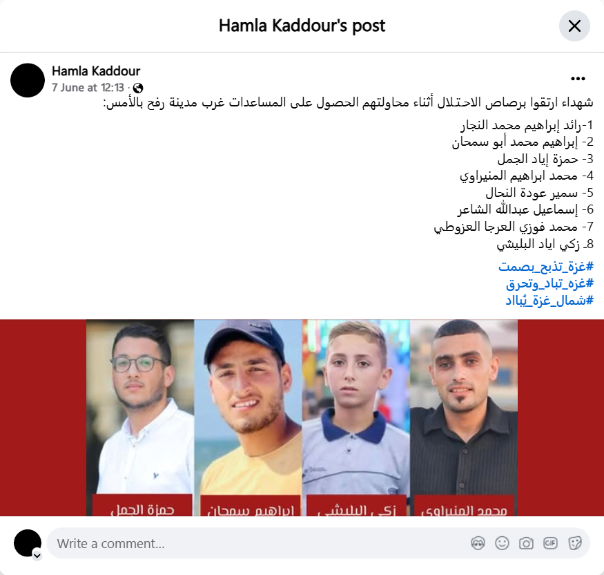 Martyrs were killed by the occupation forces' bullets while trying to get aid west of Rafah yesterday: 1- Raed Ibrahim Muhammad al-Najjar 2- Ibrahim Muhammad Abu Samhan 3- Hamza Iyad al-Jamal 4- Muhammad Ibrahim al-Munirawi 5- Samir Awda al-Nahhal 6- Ismail Abdullah al-Shaer 7- Muhammad Fawzi al-Arja al-Azouti 8- Zaki Iyad al-Balishi #Gaza_is_being_slaughtered_silently #Gaza_is_being_annihilated_and_burning #North_Gaza_is_being_annihilated