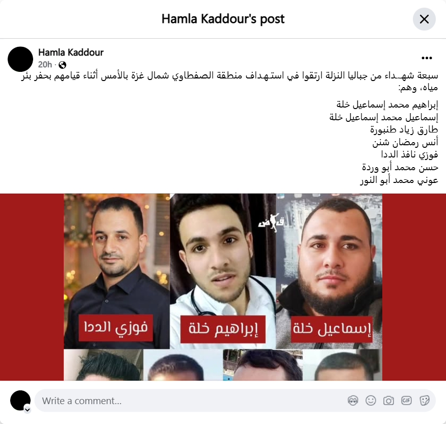 سبعة شهـ.ـدlء من جباليا النزلة ارتقوا في استـهـداف منطقة الصفطاوي شمال غزة بالأمس أثناء قيامهم بحفر بئر مياه، وهم:إبراهيم محمد إسماعيل خلةإسماعيل محمد إسماعيل خلةطارق زياد طنبورة أنس رمضان شننفوزي نافذ الدداحسن محمد أبو وردة عوني محمد أبو النور