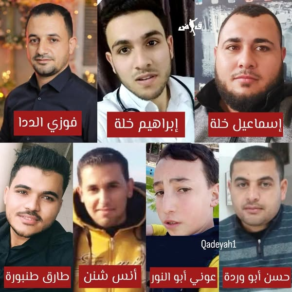 Seven martyrs from Jabalia Al-Nazla were killed in the targeting of the Al-Saftawi area in northern Gaza yesterday while they were digging a water well. They are: Ibrahim Muhammad Ismail Khala, Ismail Muhammad Ismail Khala, Tariq Ziad Tanboura, Anas Ramadan Shannfozi, Nafith Al-Dada, Hassan Muhammad Abu Warda, Awni Muhammad Abu Al-Nour.