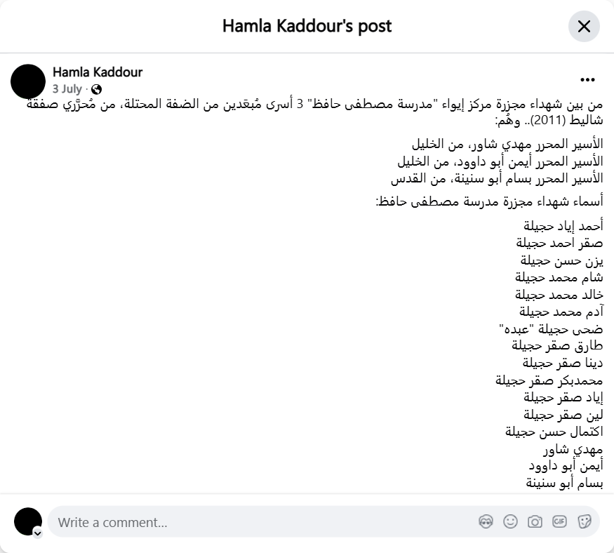 ‏من بين شهداء مجزرة مركز إيواء "مدرسة مصطفى حافظ" 3 أسرى مُبعَدين من الضفة المحتلة، من مُحرَّري صفقة شاليط (2011).. وهُم: