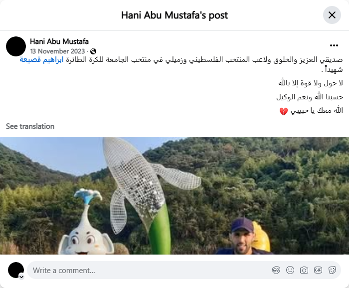 My dear and well-mannered friend, Palestinian national team player and colleague in the university volleyball team, Ibrahim Qasi'a, was martyred.