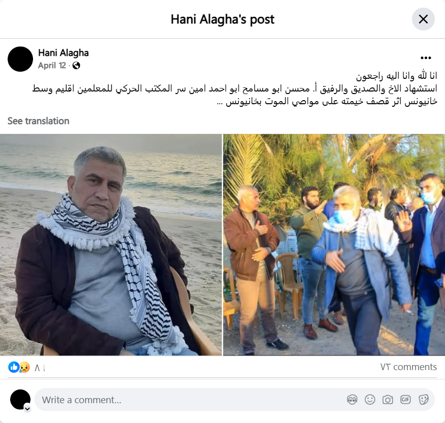 We belong to Allah and to Him we shall return. The martyrdom of our brother, friend and comrade, Mr. Mohsen Abu Musameh Abu Ahmed, Secretary of the Teachers' Movement Office in the Central Khan Yunis Region, as a result of the bombing of his tent on the Mawasi al-Mawt in Khan Yunis...