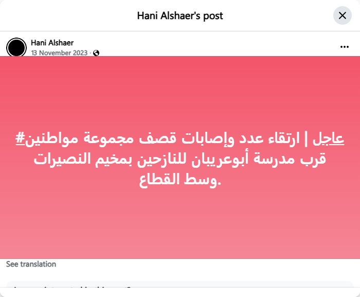 #Urgent | The number of casualties and injuries has risen due to the bombing of a group of citizens near the Abu Oraiban School for the displaced in the Nuseirat camp in the central Gaza Strip. #Urgent | The number of casualties and injuries has risen due to the bombing of a group of citizens near the Abu Oraiban School for the displaced in the Nuseirat camp in the central Gaza Strip.