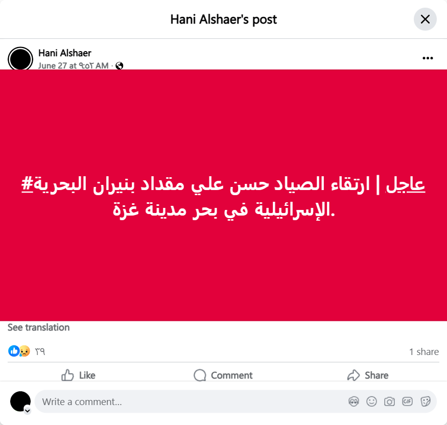#Urgent | Fisherman Hassan Ali Muqdad killed by Israeli naval fire off the coast of Gaza City.