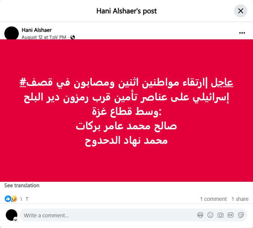Archive URL: https://airwars.org/source/www-facebook-com-hani-alshaer-pfbid02gp6or7ef9q8eusyawycrde6yyj38kczcozpvz4fujfcrcrk5sv3xmxvtccddeefxl-2025-08-12-090000/