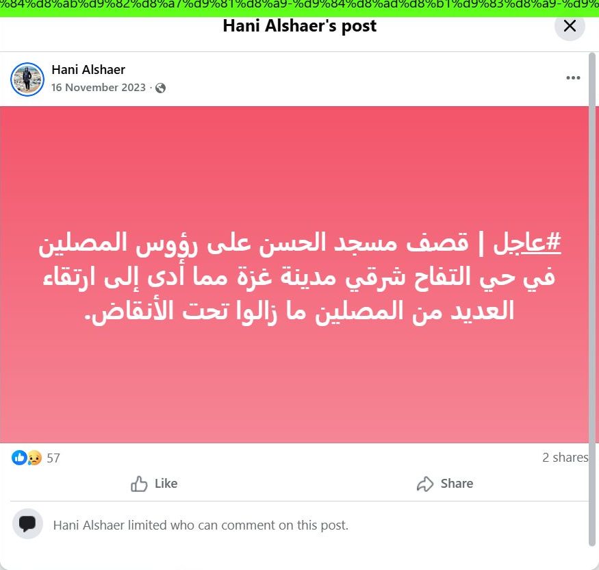 #Urgent | Al-Hassan Mosque was bombed while worshippers were inside in the Al-Tuffah neighborhood, east of Gaza City, resulting in the deaths of many worshippers who are still trapped under the rubble.