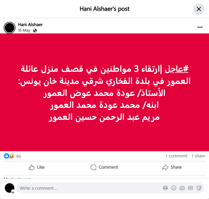 #Urgent | 3 citizens killed in the bombing of the Al-Amour family home in the town of Al-Fakhari, east of Khan Yunis: Mr. Awda Muhammad Awad Al-Amour, his son/ Muhammad Awda Muhammad Al-Amour, Maryam Abdul Rahman Hussein Al-Amour #Urgent | 3 citizens killed in the bombing of the Al-Amour family home in the town of Al-Fakhari, east of Khan Yunis: Mr. Awda Muhammad Awad Al-Amour, his son/ Muhammad Awda Muhammad Al-Amour, Maryam Abdul Rahman Hussein Al-Amour