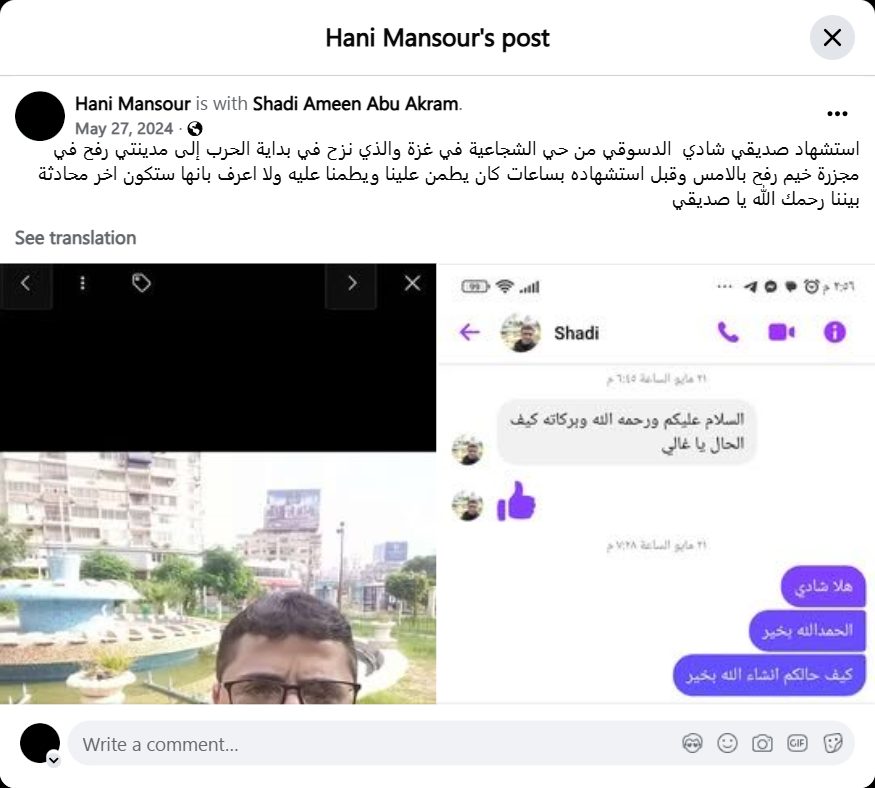 The martyrdom of my friend Shadi Al-Dasouqi from the Shujaiya neighborhood in Gaza, who was displaced at the beginning of the war to my city of Rafah in the Rafah tents massacre yesterday. Hours before his martyrdom, he was checking on us and reassuring us about him, and I did not know that it would be the last conversation between us. May God have mercy on you, my friend.