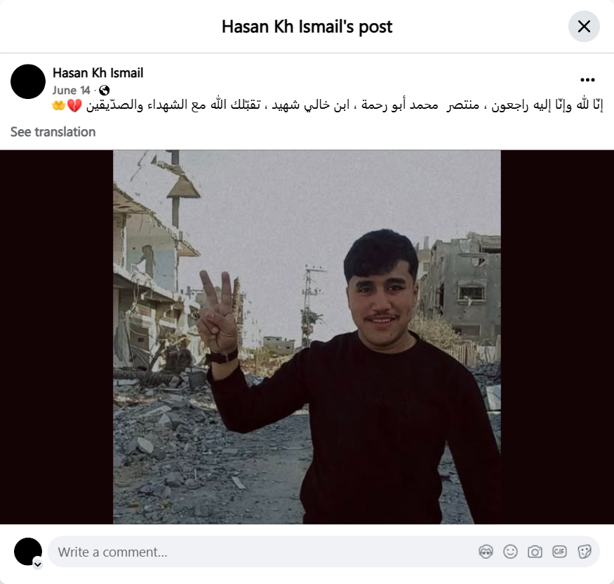 إنّا لله وإنّا إليه راجعون ، منتصر محمد أبو رحمة ، ابن خالي شهيد ، تقبّلك الله مع الشهداء والصدّيقين