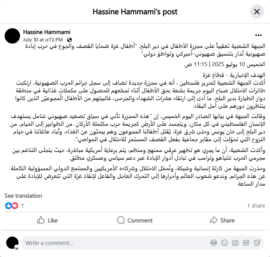 The Popular Front for the Liberation of Palestine, in response to the massacre of children in Deir al-Balah: "The children of Gaza are victims of bombing and starvation in a Zionist war of extermination orchestrated with Zionist-American coordination and international complicity."