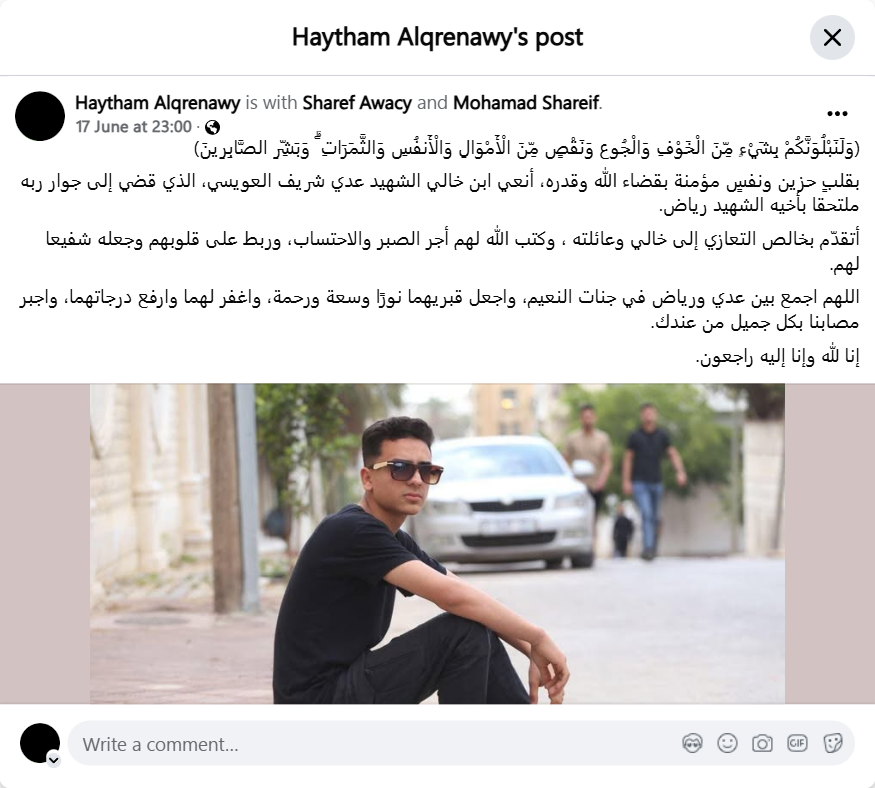 {And We will surely test you with something of fear and hunger and a loss of wealth and lives and fruits, but give good tidings to the patient.} With a sad heart and a soul that believes in Allah's will and destiny, I mourn my cousin, the martyr Uday Sharif Al-Awisi, who passed away to be with his Lord, joining his martyred brother Riyad. I offer my sincere condolences to my uncle and his family. May Allah reward them for patience and acceptance, strengthen their hearts, and make him an intercessor for them. O Allah, reunite Uday and Riyad in the gardens of bliss, and make their graves full of light, spaciousness, and mercy, and forgive them and raise their ranks, and compensate for our loss with all that is beautiful from You. To Allah we belong and to Him we shall return.