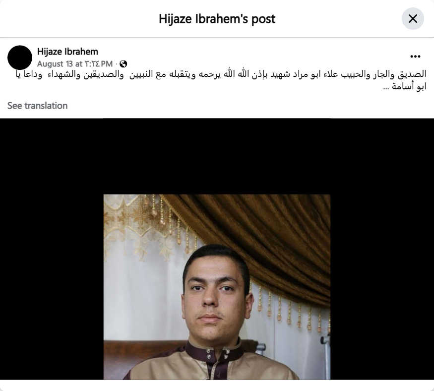 My friend, neighbor, and beloved Alaa Abu Murad is a martyr, God willing. May God have mercy on him and accept him with the prophets, the truthful, and the martyrs. Farewell, Abu Osama...