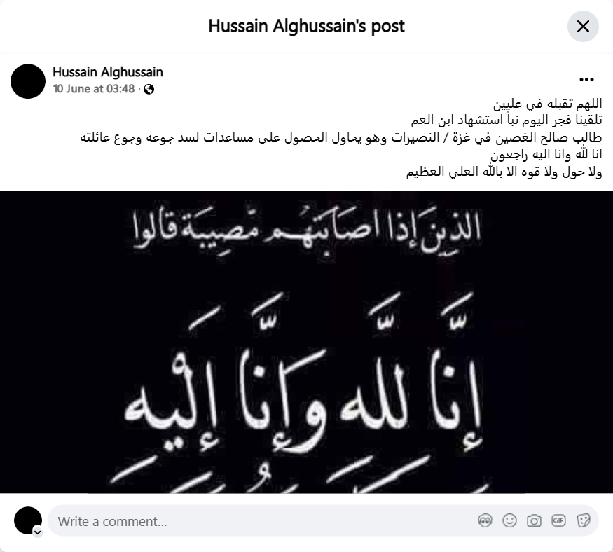 O God, accept him in the highest heavens. We received the news this morning of the martyrdom of our cousin, Talib Saleh Al-Ghussein, in Gaza/Al-Nuseirat, while he was trying to obtain aid to satisfy his hunger and the hunger of his family. To God we belong and to Him we shall return. There is no power or strength except with God, the Most High, the Almighty.