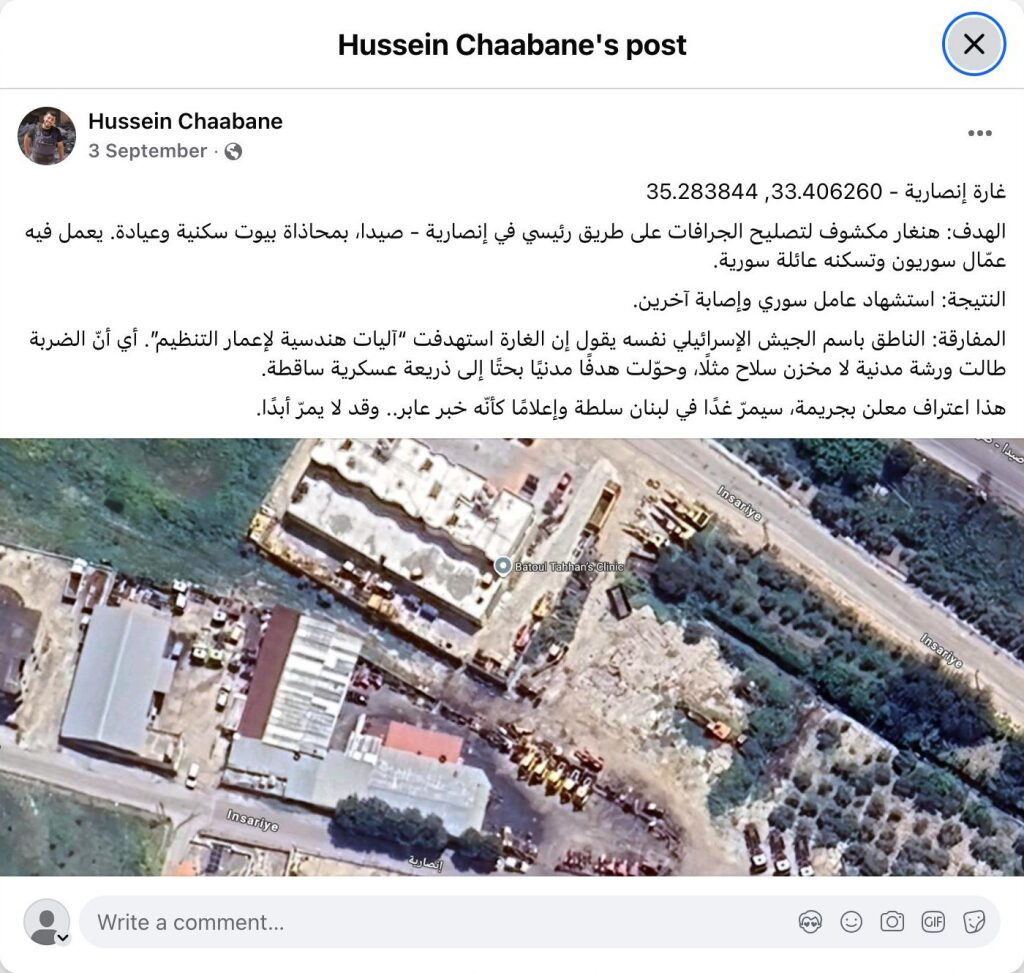 Target: An open-air bulldozer repair hangar on a main road in Ansarieh, near Sidon, adjacent to residential buildings and a clinic. Syrian workers were employed there, and a Syrian family lived in the hangar.