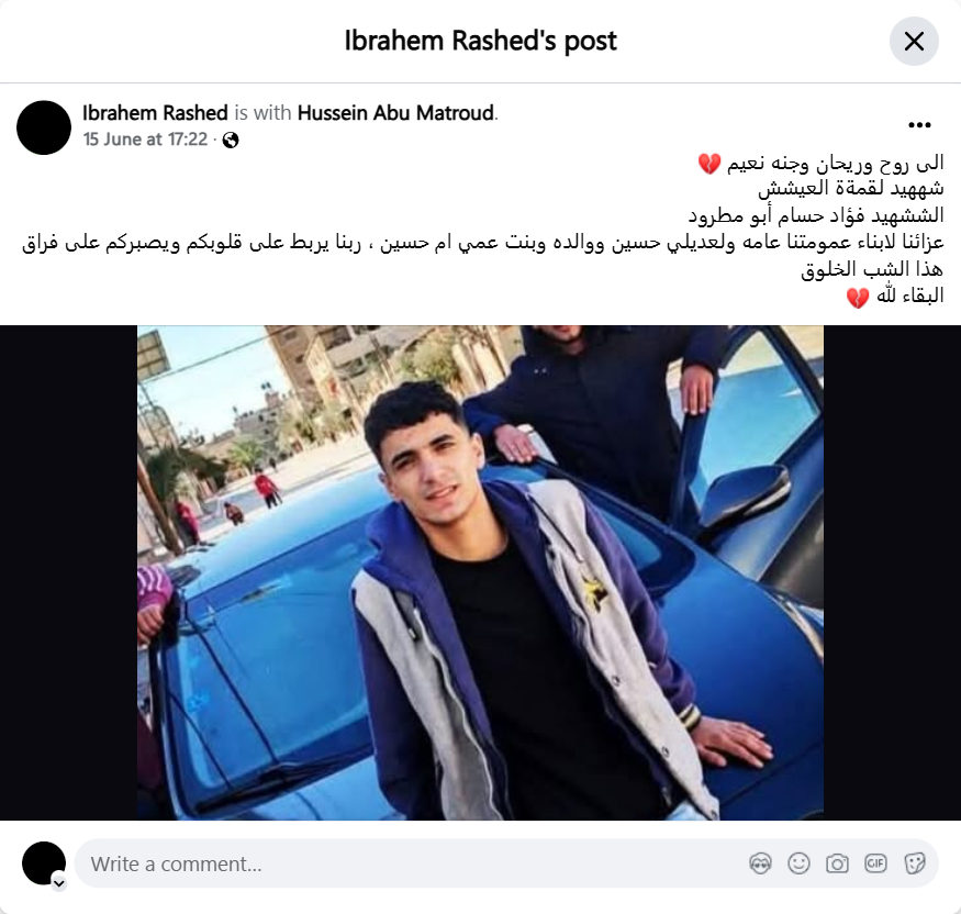 To the soul, basil, and paradise of bliss, the martyr of the livelihood, the martyr Fouad Hussam Abu Matroud. Our condolences to our cousins in general, to my cousin Hussein and his father, and to my cousin Umm Hussein. May God strengthen your hearts and give you patience for the loss of this virtuous young man. To God we belong and to Him we shall return.