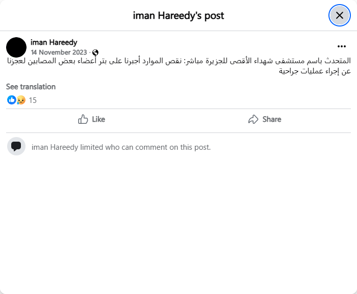 Al-Aqsa Martyrs Hospital spokesperson told Al Jazeera Mubasher: A lack of resources forced us to amputate the limbs of some of the injured because we were unable to perform surgical operations.