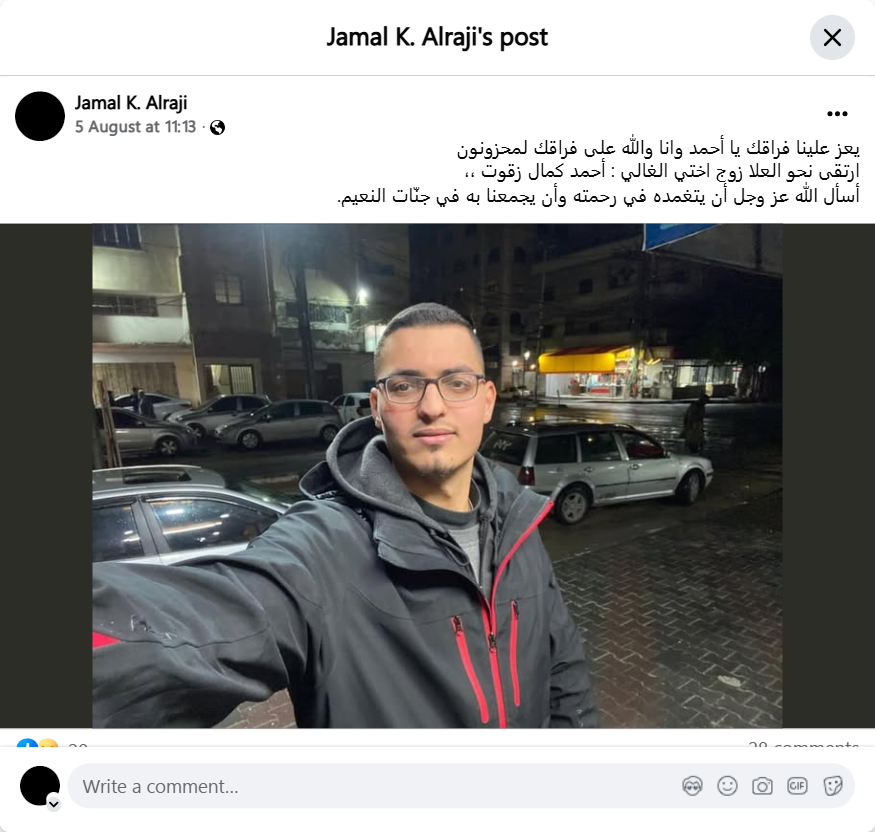 We are deeply saddened by your departure, Ahmed. I swear to God, we are truly saddened by your departure. My dear sister's husband, Ahmed Kamal Zaqout, has passed away. I ask God Almighty to have mercy on him and to unite us with him in the gardens of bliss.