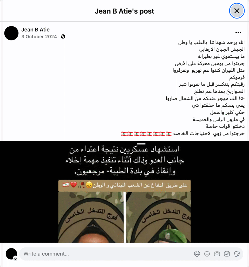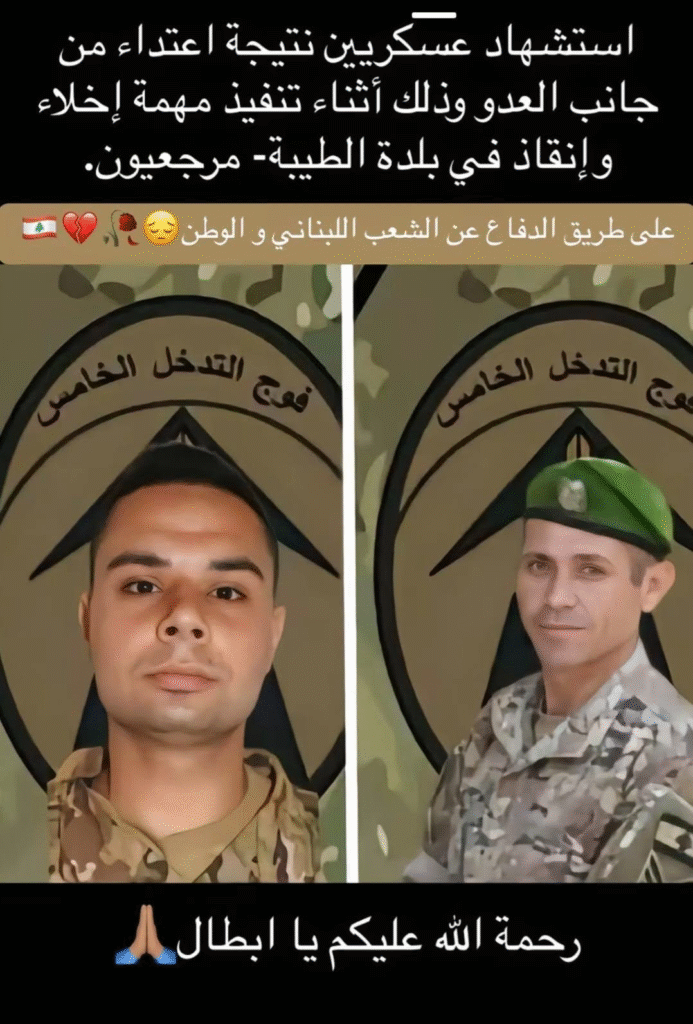 الله يرحم شهدائنا بالقلب يا وطن الجيش الجبان الارهابي ما بيستقوي غير بطيرانه جربتوا من يومين معركة على الأرض متل الفيران كنتوا عم تهربوا وتفرفروافرموكم رقبتكم بتنكسر قبل ما تفوتوا شبر الصواريخ بعدها عم تطلع ١٥٠ الف مهجر عندكم من الشمال صاروا يعني بعدكم ما حققتوا شي حكي كثير والفعل في مارون الراس والعديسة دخلتوا قوات خاصة خرجتوا من زوي الاحتياجات الخاصة