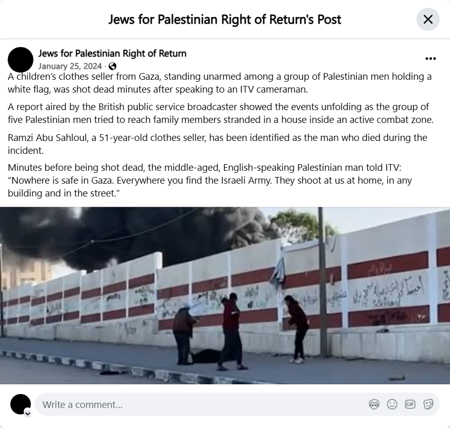 A children’s clothes seller from Gaza, standing unarmed among a group of Palestinian men holding a white flag, was shot dead minutes after speaking to an ITV cameraman.
