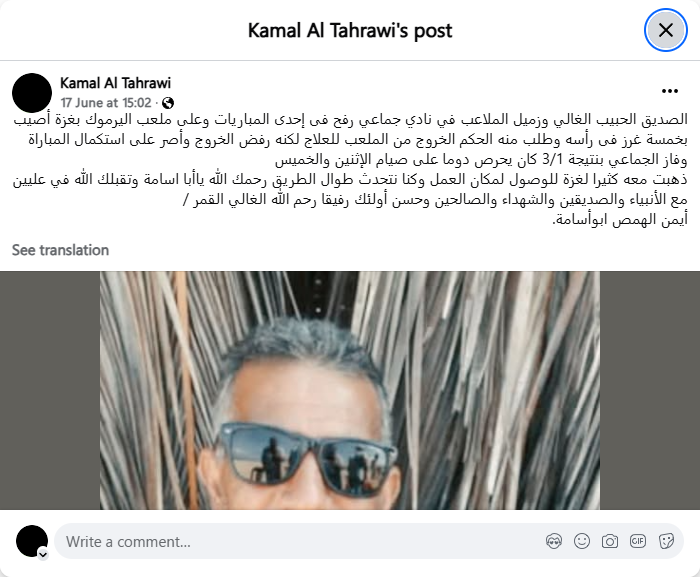 My dear and beloved friend and teammate in the Rafah Jama'i Club. In one of the matches, at Yarmouk Stadium in Gaza, he received five stitches in his head and the referee asked him to leave the field for treatment, but he refused and insisted on completing the match. Jama'i won 3/1. He was always keen to fast on Mondays and Thursdays. I went with him to Gaza a lot to get to work and we used to talk all the way. May God have mercy on you, Abu Osama, and accept you in the highest place with the prophets, the truthful, the martyrs, and the righteous. What good companions they are. May God have mercy on the dear moon / Ayman Al-Hams Abu Osama.