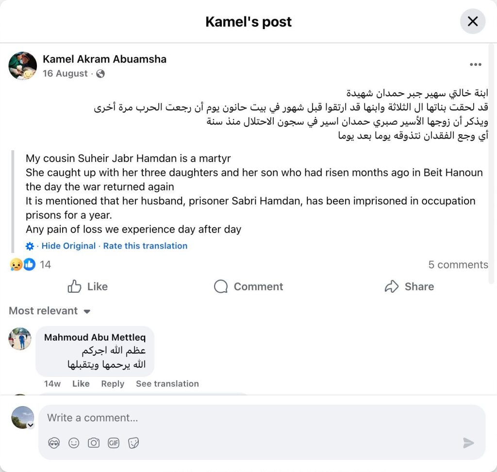 She joined her three daughters and son, who were killed months ago in Beit Hanoun when the war resumed.