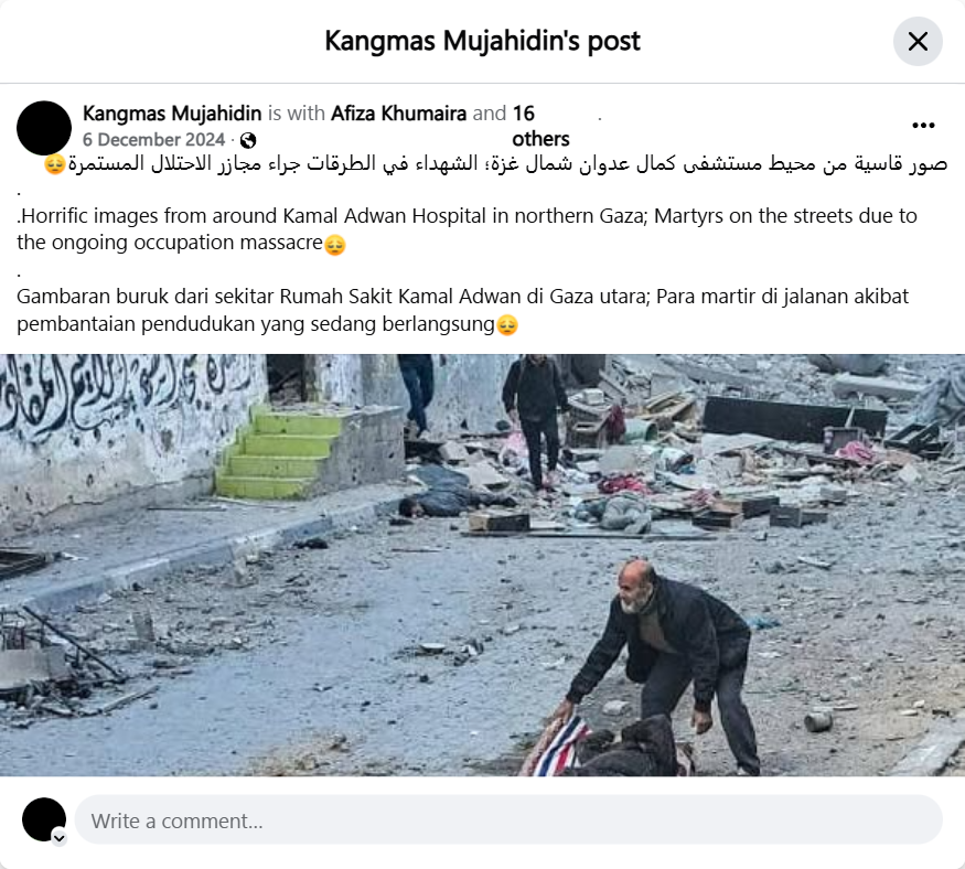 صور قاسية من محيط مستشفى كمال عدوان شمال غزة؛ الشهداء في الطرقات جراء مجازر الاحتلال المستمرة..Horrific images from around Kamal Adwan Hospital in northern Gaza; Martyrs on the streets due to the ongoing occupation massacre .Gambaran buruk dari sekitar Rumah Sakit Kamal Adwan di Gaza utara; Para martir di jalanan akibat pembantaian pendudukan yang sedang berlangsung