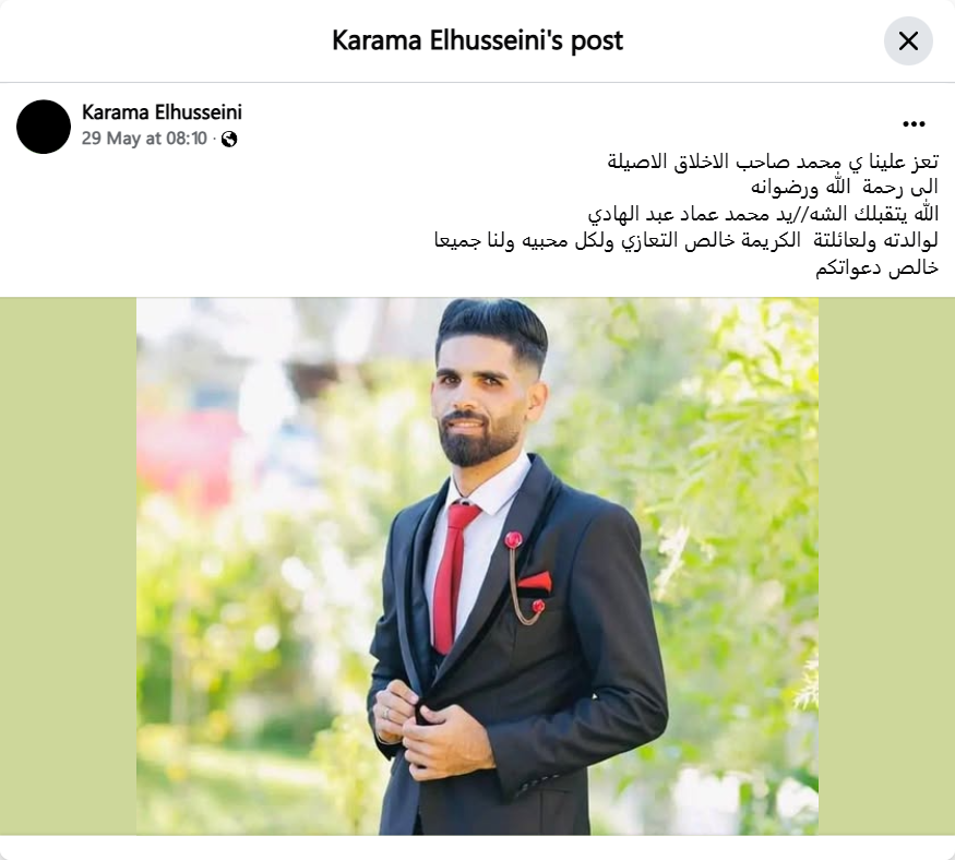 We mourn the passing of Muhammad, the man of noble morals. May God have mercy on him and accept him. The martyr Muhammad Imad Abdel Hadi. Our sincere condolences to his mother and his honorable family, to all his loved ones, and to all of us, your sincere prayers.