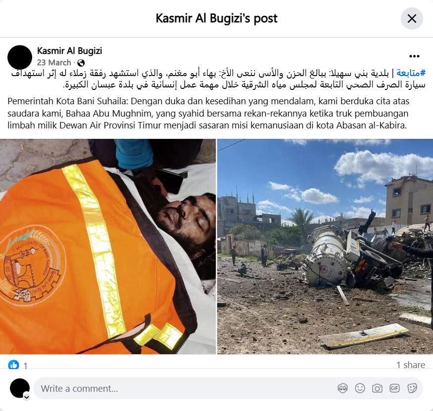 #متابعة | بلدية بني سهيلا: ببالغ الحزن والأسى ننعى الأخ: بهاء أبو مغنم، والذي استشهد رفقة زملاء له إثر استهداف سيارة الصرف الصحي التابعة لمجلس مياه الشرقية خلال مهمة عمل إنسانية في بلدة عبسان الكبيرة.Pemerintah Kota Bani Suhaila: Dengan duka dan kesedihan yang mendalam, kami berduka cita atas saudara kami, Bahaa Abu Mughnim, yang syahid bersama rekan-rekannya ketika truk pembuangan limbah milik Dewan Air Provinsi Timur menjadi sasaran misi kemanusiaan di kota Abasan al-Kabira.