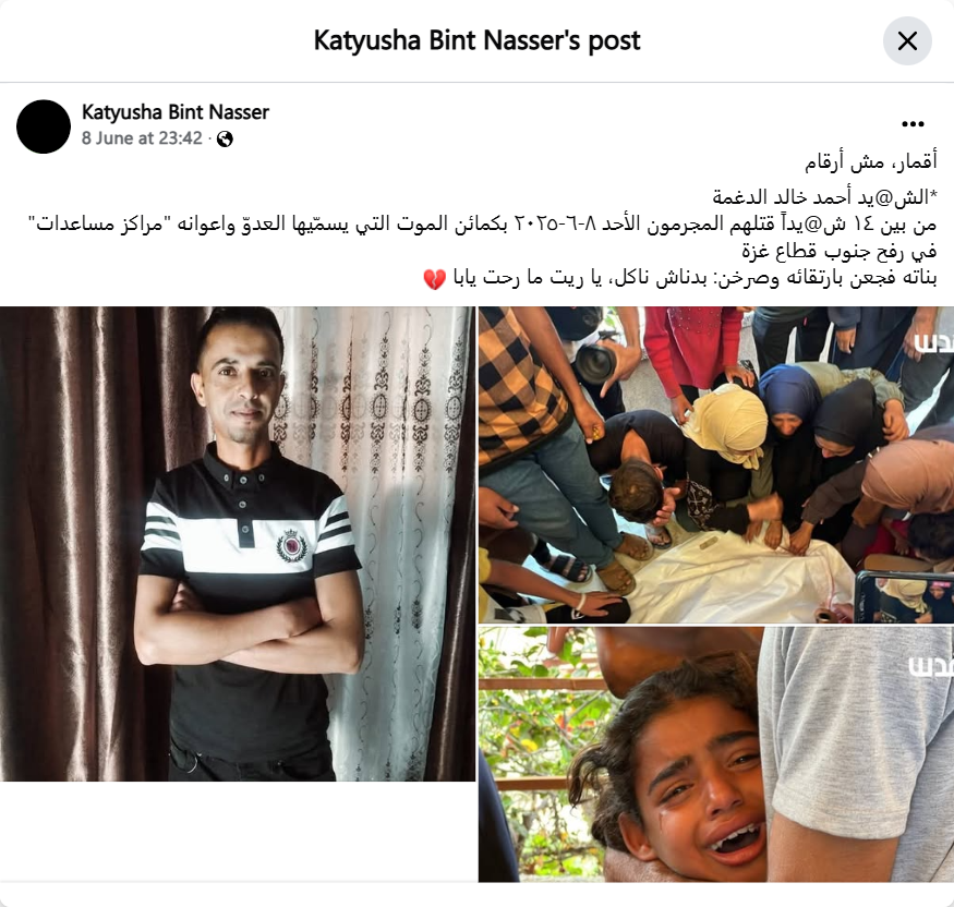 Moons, not numbers* The martyr Ahmed Khaled Al-Daghma is among 14 martyrs killed by criminals on Sunday 6/8/2025 in the death ambushes that the enemy and its agents call “aid centers” in Rafah, south of the Gaza Strip. His daughters were shocked by his death and cried: We don’t want to eat. I wish you hadn’t left, Dad.