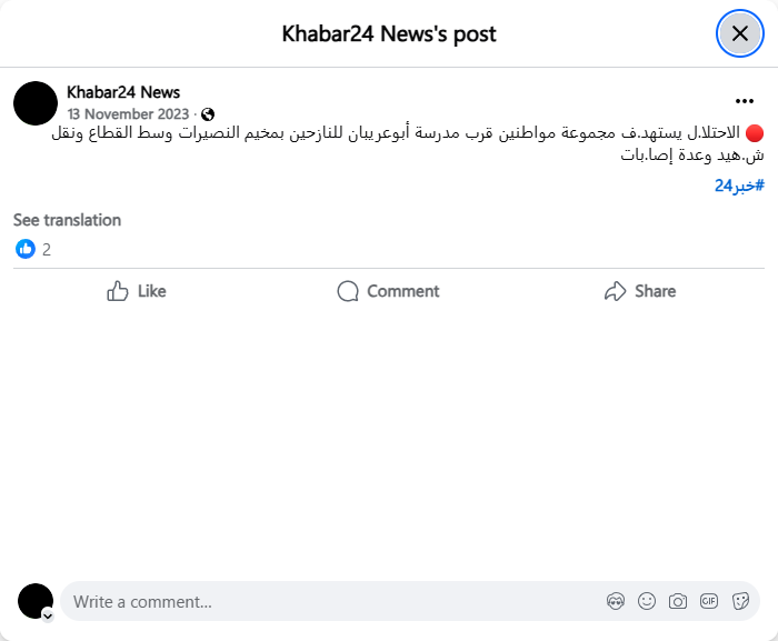 The occupation targets a group of citizens near Abu Oraiban School for the displaced in Al-Nuseirat camp in the central Gaza Strip, and a martyr and several injuries were transferred #News24