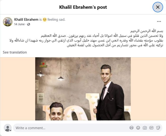 In the name of God, the Most Gracious, the Most Merciful. "And do not think that those who were killed in the cause of God are dead; rather, they are alive with their Lord, receiving provision." (Quran 3:169) With hearts believing in God's decree and destiny, I mourn my cousin, Muhannad Khalil Ayoub, who ascended to his Lord as a martyr, God willing. We do not presume to judge him before God. He was killed in the Netzarim area while trying to earn a living.